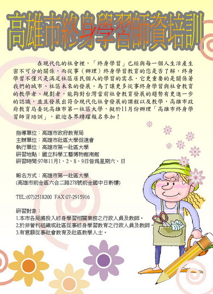 <P><A href="http://noukico.pixnet.net/album/photo/102117425"><IMG alt="" src="http://pic.pimg.tw/noukico/normal_48ee3f3d3c377.jpg" border=0></A> </P> <P>附件:<A href="http://khhcu.sam.com.tw/files_get.php?id=294">高雄市終身學習師資培訓計畫報名表.doc</A> </P>